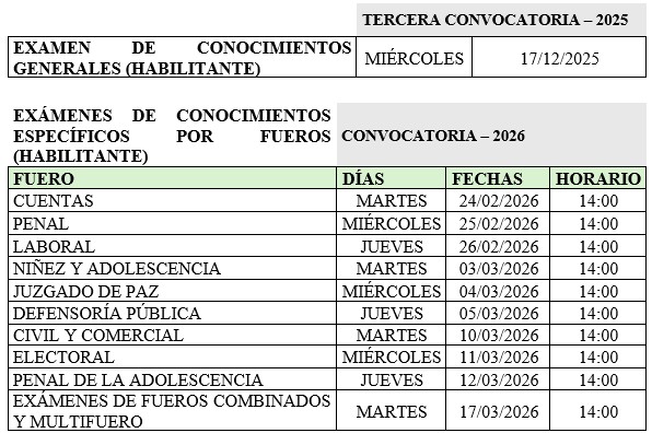 El Pleno del Consejo de la Magistratura, en Sesión Ordinaria del 1 de diciembre de 2025, aprobó el calendario para los Exámenes de Conocimientos Generales y Específicos por Fueros Habilitantes, a realizarse durante los meses de diciembre de 2025 y febrero y marzo de 2026. Estas evaluaciones están dirigidas a los postulantes que se encuentran concursando para diversos cargos judiciales.